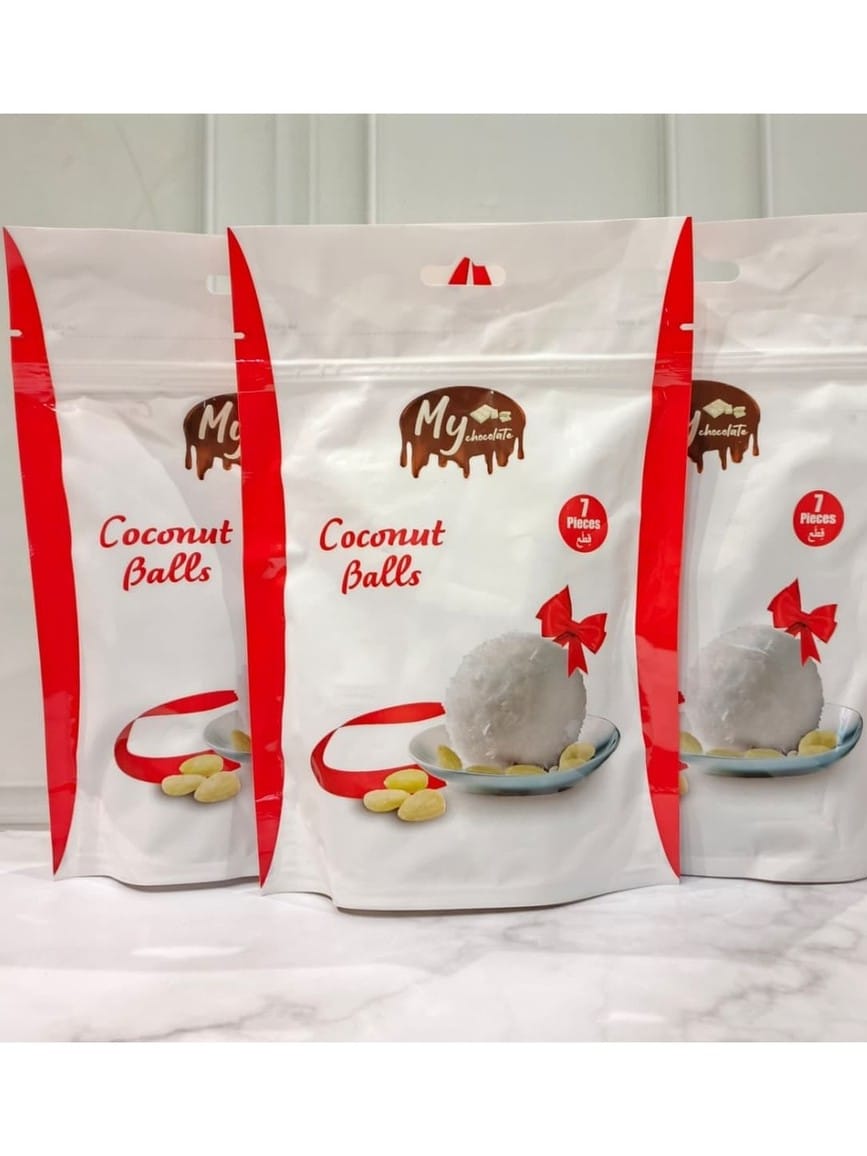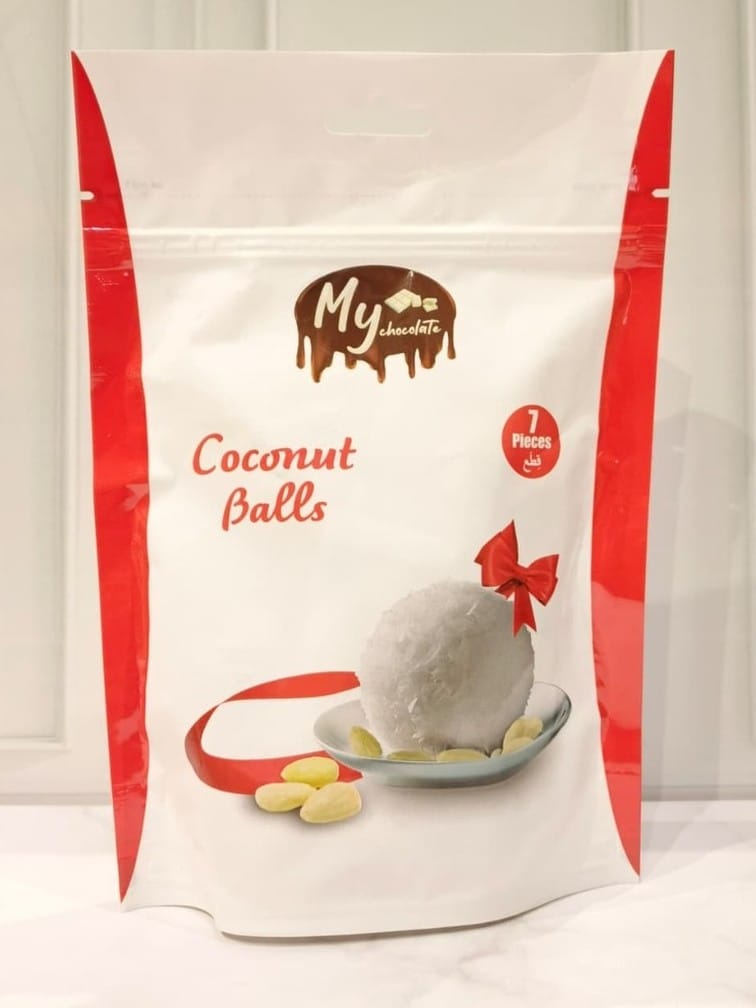 Premium White Coklat dengan isiin wafer, kream kelapa dan kacang almond dibalut dengan taburan lembut butiran kelapa parut.